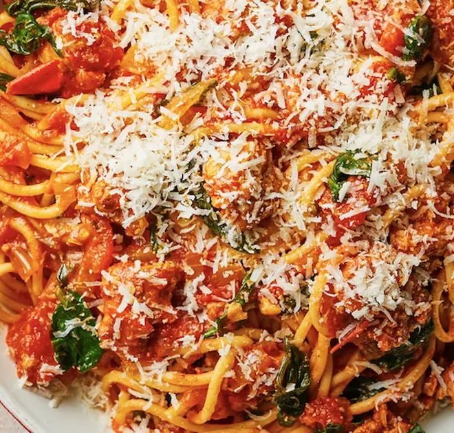 Video LoadingVideo UnavailableClick to playTap to playThe video will auto-play soon8CancelPlay now Social media sensation and foodie influencer Sarah Rossi aka Taming Twins has been inspiring families to create speedy, fuss-free family food on a budget via her Instagram since 2013. Now she’s written a book called ‘What’s For Dinner?’ and shares her secrets to delicious meals that take just 30 minutes, from pan-to-plate. “I think about dinner before I even get out of bed in the morning” says Sarah, so there is no surprise she’s very organised! Her new book is packed with 100 recipes, ten weekly meal plans, plus shopping lists for absolutely everything you need. It promises to take the pain out of planning and provide a solution to those daily dinner dilemmas. Here are some of our favourite picks from her book… Sausage spaghetti with spinach